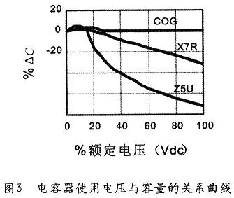 ①電容器的使用電壓對電容器的電容量有影響,穩(wěn)定性低的介質,在施加額定工作電壓后容量會大幅度下降(見圖3),以至達不到使用效果,這一點在選擇電容器時必須給以充分注意(不能一味追求大容量和小體積,必須在容量和使用電壓上留有充分余地)。