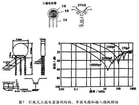 由于普通的兩端電容有引線電感,所以總的剩余電感較大,自諧振點也比較低。為了改進普通引線式電容器的自諧振、且自諧振頻率偏低的問題,村田制作所曾發(fā)展了一種引線式三端電容器,見圖7。與兩端電容相比,這個電容的上引線化成了兩根(所以三端電容有三根引線)。三端電容器的這兩根上引線化成了信號傳輸線的一部分,于是引線電感與電容器變成了一個“LC”濾波器。正是三端電容器巧妙地利用了引線電感,使得三端電容器對干擾的抑制作用更好。三端電容器也有自諧振問題,為了最大限度地限制這個問題,使用時三端電容器接地的這根引腳的長度應該受到限制。