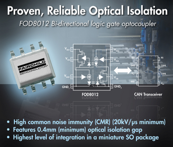 為幫助設(shè)計(jì)人員應(yīng)對挑戰(zhàn),飛兆半導(dǎo)體公司(Fairchild Semiconductor)開發(fā)出業(yè)界首款全雙工、雙向邏輯門光耦合器FOD8012,它具有高抗噪能力和經(jīng)驗(yàn)證的可靠光隔離性能,適用于工業(yè)現(xiàn)場總線通信、可編程邏輯控制、伺服控制,以及逆變器、工廠自動化、過程控制和測試測量等應(yīng)用。