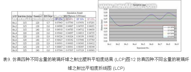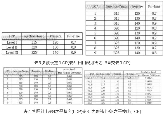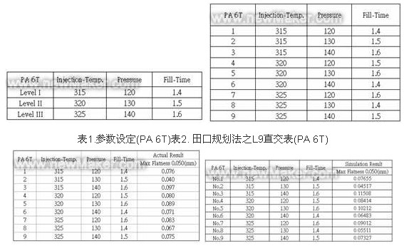 [page]塑料射料LCP在已設定射出溫度、射出壓力、充填時間之條件參數(shù)后,再設定仿真之各參數(shù),如表5所示。透過田口方法實驗規(guī)劃,可得L9直交表,如表6所 示。依據(jù)L9直交表,可清楚得知有9組田口規(guī)劃之實驗參數(shù),再分別針對這9組參數(shù),實際作射出成形,并量測實際翹曲度,量測之結果,大部份數(shù)據(jù)皆不符合塑 料翹曲度(Flatness) 0.05mm規(guī)格內(nèi),如表7所示。仿真之最佳化參數(shù)為第三組,其參數(shù)為射出溫度315℃、射出壓力 140 MPa 、充填時間0.9 s,如圖3所示。