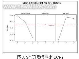 由實驗數(shù)據(jù)輸入田口法計算機程序后,經(jīng)因子變動計算,可得S/N(訊號/噪聲比),如圖2所示。由S/N得到最佳化參數(shù)為,射出溫度315℃、射出壓力 130 MPa、充填時間1.5 s。此最佳化參數(shù)出現(xiàn)于田口規(guī)劃法L9直交表內(nèi)之第二組實際數(shù)據(jù),而且實際射出與仿真射出所得之數(shù)據(jù)也都是第二組為最佳的,由此可得知PA 6T田口法最佳化組合與實際射出與仿真射出是互相對應的,符合理論與實務相互映證,最佳化成形之塑料其平坦度為0.04mm,符合平坦度不超過 0.05mm之目標值。