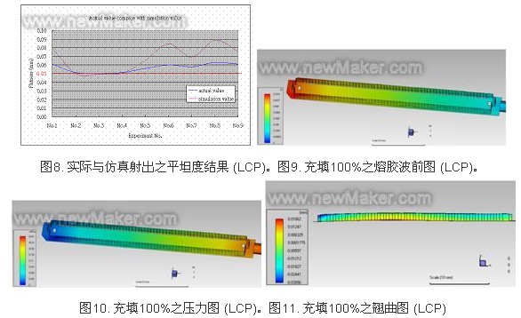 從LCP之S/N(訊號/噪聲比),可觀察出,除 了射出溫度外,射出壓力與充填時間,均未有相當明顯的趨勢,S/N(訊號/噪聲比)亦是取最大值,故所呈現(xiàn)之最佳參數(shù)為射出溫度315℃、射出壓力130 Mpa、充填時間0.8 s,這組最佳化成形參數(shù),正好出現(xiàn)于田口規(guī)劃法L9直交表內(nèi)之第2組實驗數(shù)據(jù),然而實際射出成形第二組之塑料平坦度數(shù)據(jù)為0.051mm,此量化數(shù)據(jù)未符合于0.050mm目標值內(nèi),實際射出最佳值是第3組,其平坦度數(shù)據(jù)為0.050mm符合目標值之內(nèi),與田口法之最佳化組合相比,兩者不相符;其余8組均未符合不超過平坦度0.050mm目標值內(nèi)。實際射出之數(shù)據(jù)中,第三組實驗數(shù)據(jù)是0.050mm最佳的,次者為第二、四組,兩組實際射出之塑料平坦度為 0.051mm;在此說明為何田口規(guī)劃之第二組最佳化成形,于實際射出中,并不是最好的,因為從S/N(訊號/噪聲比) ,可觀察出,射出溫度的斜率趨勢是相當清楚的,但射出壓力所呈現(xiàn)之斜率趨勢卻是相當不明顯的,并且其值已相當接近S/N標準值(紅色虛線),這顯示在此射料LCP中,射出壓力所扮演的參數(shù),并不屬于關鍵參數(shù),但反之也可以說,因設定之射出壓力太高,導致斜率趨勢不明顯,然就充填時間0.8s、0.9s而言,其呈現(xiàn)兩者相互接近之狀況,與0.7s區(qū)隔相當明顯,這顯示出時間以0.8s、0.9s,均為佳,0.7s是不可行之參數(shù)。綜合上述之因素,可能因為設定射出壓力過大,導致射出成形之實驗值,無法很明確被區(qū)分,對此將安排實驗,以厘清射出壓力影響程度為何,故田口規(guī)劃法L9直交表內(nèi)之第二組實驗數(shù)據(jù)最佳化成形之組合,雖然未符合不超過0.050mm目標值內(nèi)、但與三、四組均相當接近,僅差0.001mm,如圖8所示,此實驗仍具有參考性,從仿真射出中可得到LCP所須之壓力較小,如圖9-圖11所示,在此可得知,射出溫度為最重要,次之為射出時間,再者為射出壓力。