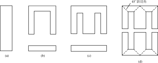 鐵基非晶合金鐵心結構也分為疊片式和卷繞式兩種。疊片式鐵心是比較早期的結構,是把鐵基非晶合金帶材剪切成一定的鐵心片后,再疊裝成一定結構形狀的鐵心。鐵基非晶合金帶材厚度一般為20μm~40μm,疊裝起來既費時又不容易疊好。為了縮短工時和增加鐵心強度,把幾片和十幾片薄鐵心片粘接在一起,成為0.1mm~0.25mm厚的鐵心片,但是損耗也有所增加。鐵基非晶合金磁性不存在取向問題,但是剪切加工困難,一般鐵心片形狀都為單I形(圖6),疊裝后的鐵心截面都為矩形。鐵心柱數也分為單相電磁元件用的兩柱式和三相電磁元件用的三柱式兩種。由于需要大量的工時,疊裝式鐵基非晶合金鐵心結構現在已很少使用。但是在150μm鐵基非晶合金帶材工藝成熟之后,仍然有可能采用疊裝式鐵心結構。