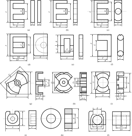 軟磁鐵氧體的鐵心結構比較多,這是由于采用熱壓工藝,比較容易加工成各種形狀。有EI、EE、EER、EP、UF、UYF、RM、PM、PQ、Q(罐形)、T(環形)和LP形等等(圖8)。EI形以尺寸A(E形鐵心寬度)為標志,EE形以尺寸A(E形鐵心寬度)和2×B(E形鐵心長度)為標志,已形成EI10~50,EE8.3/8.0~110/80系列,品種多,制造工藝簡單成熟,散熱好,便于引出接線,成本較低。缺點是鐵心中間柱截面為方形,給線圈繞制帶來麻煩。同時,無屏蔽,容易產生雜散磁場干擾。EER形也是以尺寸A(E形鐵心寬度)和2×B(E形鐵心長度)為標志,已形成EER25/33~54/50系列,鐵心中間柱截面為圓形,繞線比較方便,同時繞線長度比方形截面縮短11%,從而降低銅損。
