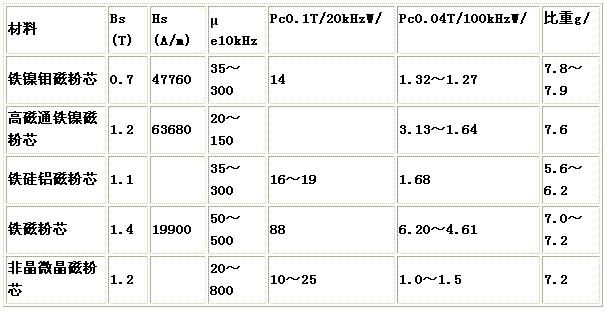 對磁粉芯提出的指標有飽和磁通密度Bs、有效磁導率μe、有效品質因數Qe、有效磁導率溫度系αμe及居里點、比重等。主要的磁粉芯的性能參數如表1所示。鐵鎳鉬磁粉芯國家標準型號為FN81,上海鋼鐵研究所型號為SN,美國阿諾德公司型號為MPP,磁導率高,工作環境適應范圍廣,損耗低,但價格貴。鐵鎳高磁通磁粉芯國家標準型號為FN50,美國阿諾德公司型號為HF,飽和磁通密度高,磁導率中等,損耗也較低,價格較便宜,國內外最近比較重視研究和使用。鐵硅鋁磁粉芯上海鋼鐵研究所型號為SA,美國阿諾德公司型號為MS,是一種價格較低,綜合性能指標較好的磁粉芯。鐵磁粉芯上海鋼鐵研究所型號SF,國外一般型號為IP,磁導率和飽和磁通密度高,但在高頻下損耗大,只適用于低頻和20kHz以下的中頻使用。由于價格便宜,可以把它加工成大型磁粉芯,代替硅鋼,作為大容量直流電源的濾波電抗器。