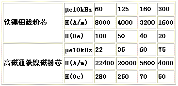 除了表1所列性能而外,一般還給出有效磁導率μe與頻率f的關系曲線。與軟磁鐵氧體類似,在超過一定極限工作頻率以后,有效磁導率會迅速下降。同時,還給出在有效磁導率μe下降50%的外加磁場強度,也就是恒磁范圍。表2是鐵鎳鉬磁粉芯和高磁通鐵鎳磁粉芯的恒磁范圍。還有,對用于輸出濾波器的磁粉芯,必須給出交直流同時磁化曲線,表示在大的直流磁化條件下,磁粉芯有效磁導率的變化情況。