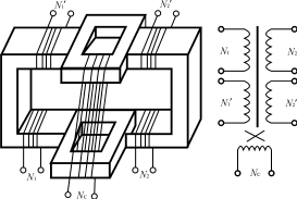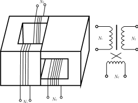 從20世紀80年代末開始,對由垂直形鐵心構成的立體布置的多功能鐵心結構進行研究的人員越來越多。最早是有人把C形鐵心的一半轉90°而形成的,發現在沒轉90°的C形鐵心上的繞組之間仍存在變壓器功能,轉90°的C形鐵心上繞上一個繞組,可以通過電流激磁后,改變沒轉90°的C形鐵心上繞組的電感〔見圖11(a)〕。后來把鐵心去掉一些變成圖11(b),仍然具有這樣的功能。圖11(c)是把兩個變壓器和兩個可控電感組合在一起的多功能鐵心結構。
