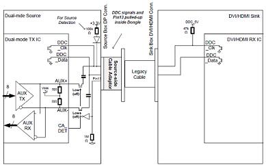 對于一個雙模源端設(shè)備而言,監(jiān)視接口13管腳上的電壓值是可選的。通常情況下,雙模源端設(shè)備會先嘗試進(jìn)行AUXCH讀操作。如果讀操作失敗,該雙模源端設(shè)備會進(jìn)行DDC讀寫操作,用于檢測適配器是否連接。