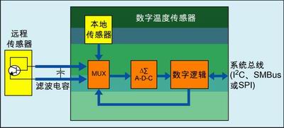 具體來說,數(shù)字溫度傳感器的主要構(gòu)成包括一個雙電流源、一個Δ-Σ A/D轉(zhuǎn)換器、數(shù)字邏輯和一個通向數(shù)字器件(如與一個微處理器或微控制器連接)的串行接口(如I2C總線、SMBus或SPI)。數(shù)字溫度傳感器有兩種:本地或遠(yuǎn)程溫度傳感器,它們均采用某種方法強(qiáng)制兩個成比例的電流通過一個連接成二極管形式的NPN或PNP晶體管,均用于測量所導(dǎo)致的VBE變化,使用Δ-ΣA/D轉(zhuǎn)換器對電壓采樣并將數(shù)值轉(zhuǎn)換成數(shù)字格式。強(qiáng)制電流一般采用約10:1的比例。通過強(qiáng)制施加比例電流和測量兩個VBE的差值,可消除二極管上IS這一與工藝相關(guān)參數(shù)的一階效應(yīng)。