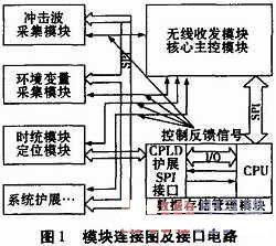 無(wú)線傳感器網(wǎng)絡(luò)節(jié)點(diǎn)采用模塊化的設(shè)計(jì)方法,每個(gè)節(jié)點(diǎn)包括無(wú)線收發(fā)模塊、核心主控模塊和功能模塊。系統(tǒng)通過(guò)無(wú)線收發(fā)模塊接收主站發(fā)送的命令碼,核心主控模塊對(duì)命令解碼,完成對(duì)各功能模塊的控制(開(kāi)啟采集、時(shí)統(tǒng)清零等)。系統(tǒng)要完成多次重復(fù)性試驗(yàn),因此每次試驗(yàn)完畢要把實(shí)驗(yàn)數(shù)據(jù)(沖擊波數(shù)據(jù)、環(huán)境變量信息、時(shí)統(tǒng)跟定位信息等)存儲(chǔ)到數(shù)據(jù)存儲(chǔ)管理模塊統(tǒng)一管理,同時(shí)準(zhǔn)備下次試驗(yàn)。系統(tǒng)工作時(shí),數(shù)據(jù)儲(chǔ)存管理模塊SPI接口一方面工作在從模式,接收主控模塊發(fā)送的命令;另一方面工作在主模式,轉(zhuǎn)發(fā)控制其他功能模塊的命令碼并讀取試驗(yàn)數(shù)據(jù)進(jìn)行統(tǒng)一管理,圖1為在其內(nèi)擴(kuò)展專(zhuān)用工作在主模式下的SPI接口的模塊問(wèn)鏈接圖。專(zhuān)用工作在主模式下的SPI接口電路,具有提高模塊間數(shù)據(jù)傳輸速度與靈活性等特點(diǎn)。