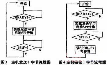 (2)軟件部分:?jiǎn)纹瑱C(jī)為主控制器,首先查詢(xún)從機(jī)狀態(tài)標(biāo)志位READY是否為1,判斷是否可以與從機(jī)通信。從機(jī)準(zhǔn)備就緒時(shí),單片機(jī)可裝載1字節(jié)發(fā)送數(shù)據(jù),啟動(dòng)CPLD內(nèi)部SPI接口電路,查詢(xún)并等待SPI傳輸結(jié)束標(biāo)志位SPIF為1,完成一字節(jié)數(shù)據(jù)傳輸,如此重復(fù)。圖3、圖4為主機(jī)發(fā)送與接收1字節(jié)流程圖。