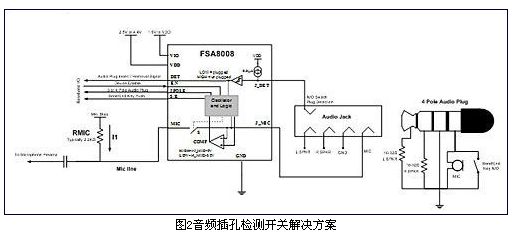 隨著手機制造商對用戶體驗的日益關注與努力提升,一種新的功能器件應運而生:音頻插孔檢測開關。像FSA8008這類檢測開關器件,可連接音頻插孔、基帶和麥克風前置放大器(圖2)。它們主要是解決現(xiàn)有解決方案存在的問題,同時提供更多的功能特性,如節(jié)省電路板空間、提高ESD性能、簡單的基帶接口,以及自動復位。