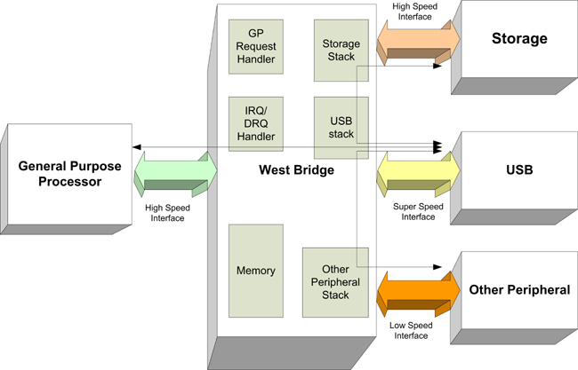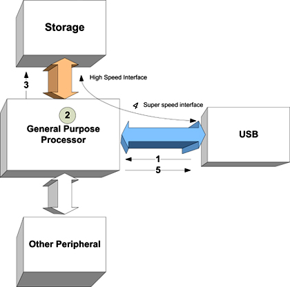 在一個普通的場景中,在device端,處理器直接連接到USB、存儲器和外設。記住這種結構,由High-Speed過渡到SuperSpeed,處理器的影響可以概括如下: