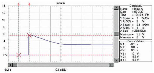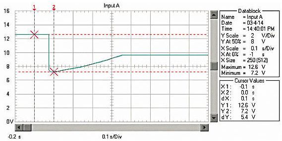 由于RM、RB、RL均非常低,啟動電流非 常大。例如用12V、45Ah的蓄電池啟動安裝1.9升柴油機(jī)的汽車,蓄電池的電壓在啟動瞬間由12.6V降到約3.6V!啟動過程的蓄電池電壓波形如圖 1;啟動瞬時的電流達(dá)550A,約為蓄電池的12C的放電率!啟動過程的蓄電池電流波形如圖2,(電流傳感器的電流/電壓變換比率:100A/V)。盡管 車用蓄電池是啟動專用蓄電池,可以高倍率放電,但在圖1中可以看出,10倍以上的高倍率放電時的蓄電池性能變得很差,而且,如此高倍率放電對蓄電池的損傷 也是非常明顯的。啟動過程的電壓劇烈變化也是極強(qiáng)的電磁干擾,可以造成電氣設(shè)備的“掉電”,迫使電氣設(shè)備在發(fā)電機(jī)啟動過程結(jié)束后重新上電,計算機(jī)在這個過程中非常容易死機(jī)。因此,無論從改善汽車電氣設(shè)備的電磁環(huán)境還是改善汽車的啟動性能和蓄電池的性能、延長使用壽命來考慮,改善汽車電源在啟動過程的性能是必要的。