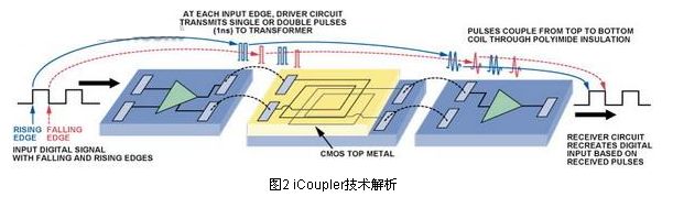 iCoupler技術(shù)(圖2)是一種基于變壓器的隔離技術(shù)。由于集成了微型變壓器和電子電路,因此它具有光耦合器技術(shù)、分立變壓器技術(shù)和半導(dǎo)體技術(shù)的所有優(yōu)點(diǎn),而且還消除了光耦合器和分立變壓器的缺點(diǎn)。光耦合器的缺點(diǎn)在于功耗過高,大的定時誤差,數(shù)據(jù)速率限制以及對溫度的敏感性。在基于 iCoupler技術(shù)的產(chǎn)品中,通過在變壓器線圈之間使用20 µm厚的聚酰亞胺絕緣層,實(shí)現(xiàn)了滿足安全機(jī)構(gòu)標(biāo)準(zhǔn)的絕緣。而且,它還能夠?qū)崿F(xiàn)超過5 kV rms的隔離等級。該技術(shù)使用申請專利的刷新電路,在沒有輸入跳變的情況下,通過刷新電路使輸出狀態(tài)輸入狀態(tài)保持匹配,由此消除了分立變壓器的固有缺陷,可以獲得準(zhǔn)確的直流電平。