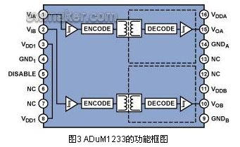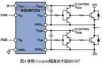 ADI公司的隔離門級驅(qū)動器系列產(chǎn)品采用iCoupler技術(shù),其中雙通道 ADuM1233(圖3)提供了輸出通道和輸入通道之間的隔離以及兩個輸出通道之間的隔離,適用于IGBT控制通道的隔離。