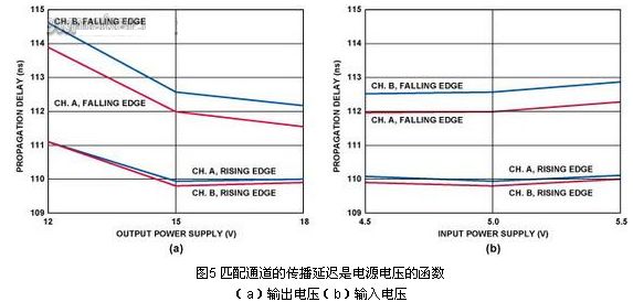 由于兩個通道之間的定時關(guān)系是十分重要的,而且PWM信號在反相階段驅(qū)動IGBT,因此與LED和光電二極管相比,iCoupler技術(shù)的速度、穩(wěn)定性和可靠性是非常出色的。如圖5的曲線所示,在輸出電壓范圍為12 V~18 V,輸入電源電壓范圍為4.5 V~5.5 V的情況下,兩個通道的上升沿的傳播延遲是匹配的,約為100 ps,而且下降沿的傳播延遲優(yōu)于1 ns。