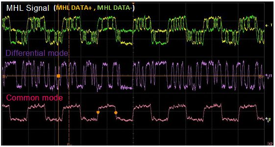接下來,MHL信號(hào)波形的測(cè)量結(jié)果如圖3所示。圖3中顯示的是MHL信號(hào)的差模成分和共模成分。從圖3我們可以清晰地看到MHL信號(hào)中不僅存在差模成分 (差分波形) ,還存在著共模成分。