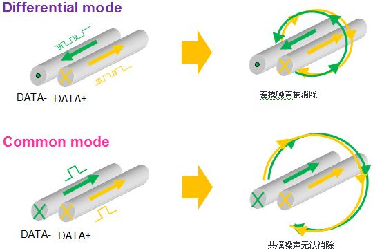 通過濾波器來消除差分傳輸信號(hào)線所產(chǎn)生的噪聲的同時(shí),需要選擇具有高效靜噪性能,且不影響波形質(zhì)量的濾波器。在差分傳輸信號(hào)線靜噪處理中,使用共模扼流線圈將更加有效。共模扼流線圈對(duì)于差分信號(hào)不產(chǎn)生任何阻抗,但對(duì)于共模信號(hào)是一個(gè)很大的阻抗,可對(duì)過大的共模干擾電流進(jìn)行有效抑制。