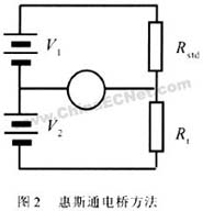 圖2中,V1,V 2是程控恒電壓源;Rstd是標準電阻; Rt是被測電阻;I是電流表。當電橋平衡即流過電流表I的電流為零時,有V1 /V2=Rstd/R t,由此可計算出Rt=R std×V2/V1 。