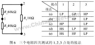 在這種情況下可以采用一種變形的開爾文連接方式來進行測試,不再使用隔離方法。它仍采用四根線,但根據需要將其中一對或兩對F,S線分開接在不同的點上來進行測試。這種方式稱為分離開爾文連接方式。本例中三個電阻要進行四次測試才能計算出它們的阻值,四次測試的接法分別見圖6中的表,圖中1,2,3點為連接點。圖6-(b) 接法可直接測出R1的值;圖6-(c)可測出 R2與R3的并聯值R p;圖6-(d)和圖6-(e)分別測出阻值R2 ′和R3′。分析可知: