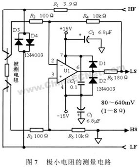對于極小阻值范圍的電阻測量可以采用圖7所示電路完成,它可以測量10~ 80mΩ的電阻。通過差分運算放大電路,把被測電阻產生的微弱電壓信號放大100倍,因此實際電阻值是測量值要除以100。圖中運放UI采用低噪聲、高速、精密運放,如OP-37EJ,AD645或MAX400。和高電位施加線(HF)串聯的電阻R1是用來匹配電流施加模塊的最佳輸出負載,R2到R5采用高精度高穩定性的電阻來保證差放電路增益的穩定,這決定了測量的精度和重復性。為了保證精度,對運放的電源電壓要求很高,電路的安裝位置要盡可能靠近被測電阻,所有探頭要盡可能短,C2,C3要盡可能靠近運放。
