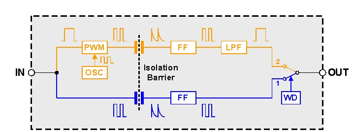 低速路徑比高速路徑多出幾個(gè)功能元件。因?yàn)榈皖l輸入信號要求隔離勢壘禁止采用大電容,所以輸入信號被用于對內(nèi)部振蕩器(OSC)的載波頻率進(jìn)行脈寬調(diào)制(PWM)。這就構(gòu)成了一個(gè)非常高的頻率,能夠通過該電容勢壘。由于輸入得到了調(diào)制,因此必須在實(shí)際數(shù)據(jù)傳輸至輸出端以前使用低通濾波器(LPF)去除其中的高頻載波。