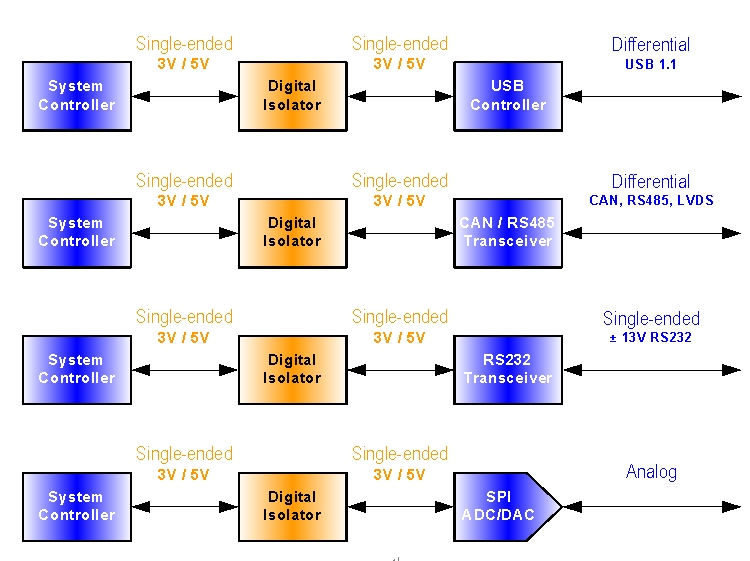 所有接口都有一個(gè)相同點(diǎn),那就是數(shù)字隔離器必須安裝在隔離接口的單端3V/5V部分。