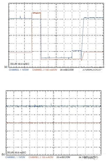 圖2顯示了保護功能的作用過程。輸出B有一個300mA的恒定負載,輸出A則在100mA負載和600 mA負載之間切換。當出現一個過載時,輸出A被關斷,但有一個20 ms的延遲,以避免對短時的瞬流作出響應(圖2a)。電路在80 ms后消除過載;再經過20 ms的延遲,自動重啟功能使輸出A重新連線。輸出B根本察覺不到輸出A的問題(圖2b)。不過,故障指示輸出端變為低,表示通道A有一個問題。