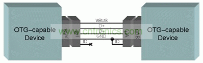 在標準 USB 中,主機上的插孔被稱作“A”連接器,而外圍設備上的插孔被稱作“B” 連接器。由于目標終端設備主要為一些小型移動消費類電子產品,因此標準“A”插孔對這些產品來說過大。按照 OTG 規(guī)范的原始版本,這些新型連接器被稱作“迷你”連接器。隨后,對該規(guī)范進行了修改,以強制規(guī)定 OTG 設備的“微型”連接器。特別是,OTG 設備必須實施一個微型 AB 插孔。這種 AB 名命表示其為批量安裝在某個單一設備中的“A”和“B”插孔。該微型 AB 插孔可以插接微型 B 插頭或者微型 A 插頭。問題似乎很清楚:如果您插一個微型 A 插頭,則設備會為一個主機;如果您插一個微型 B 插頭,則其為一個外圍設備。但是,基于微型 AB 的產品如何知道插入的是什么呢?OTG 規(guī)范給標準 USB 系統(tǒng)的四個觸點又增加了一個觸點,稱作 ID。由于 ID 引腳不在標準 USB 連接中,因此規(guī)范保留了這一點,并在 ID 引腳上定義了一個無連接,作為初始外圍設備。反過來,如果 ID 引腳接地,則設備扮演初始主機角色,如圖 1 所示。
