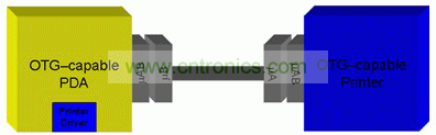 如上所述,線纜方向決定著連接處兩個 OTG 設備扮演的設備角色。主機通信協(xié)議 (HNP) 定義了一種在主機和設備角色之間動態(tài)切換的方法。為什么要切換角色呢?如果我們查看圖 2,并考慮到每個 OTG 設備都必須包括一個 TPL,我們便能理解這種要求。左邊的設備在其 TPL 上有一臺打印機,但其并“不”在打印機的 TPL 上。如果用戶“倒過來”插入線纜(如圖 2 所示),則如果不倒置角色兩個設備之間的通信便不可能進行。把線纜從兩個設備取下,然后將線纜端點倒過來再重新連接,便可以實現通信。OTG 規(guī)范內置到了協(xié)議中,以自動地應對這種情況。HNP 允許靜默和自動角色倒置,從而實現通信。相比強制規(guī)定用戶斷開線纜然后倒置,這樣做提高了最終用戶體驗。正因這樣,需要注意的主機通常為 A 設備但卻并非始終如此,這一點很重要。
