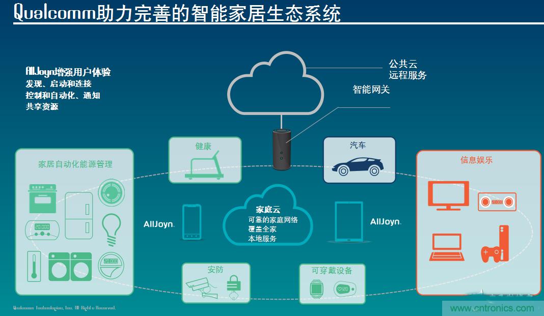 Qualcomm創銳訊物聯網市場經理貝曉珊女士在 “IoE互聯家庭解決方案概述”主題演講中談到,盡管不同的分析機構給出了不同的數據,但結論是統一的,即物聯網市場規模的巨大化。而高通創銳訊將致力于端到端的IOE解決方案,助力完善智能家居生態系統。會議上貝曉珊詳細介紹了兩款WIFI芯片產品QCA4004和QCA4531以及AllJoyn SDK軟件平臺。