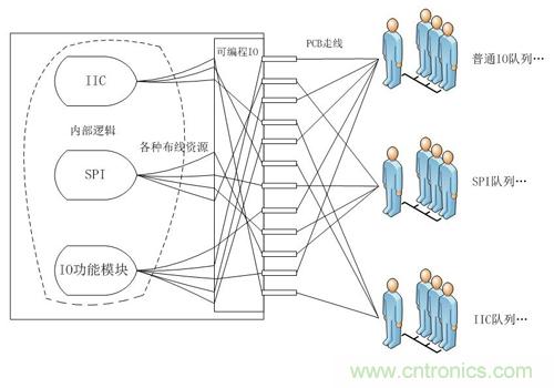 FPGA就以靈活性見長,可編程IO就是其中的一個重要功能??删幊蘄O給PCB的設計帶來靈活性,可以簡化PCB的布局布線,并且在設計的過程中,還可以根據走線的走向更改管腳的連接。另外,在FPGA內部邏輯設計過程中,可以先把功能模塊設計與管腳分配兩步獨立開來,先完成內部邏輯功能之后,再根據實際情況分配管腳。因此,可編程IO給FPGA邏輯設計和PCB設計帶來一定的靈活性和獨立性,其在這個環節中充當一個“千手觀音”的角色,為邏輯設計和PCB設計鋪路架橋,如圖2所示。