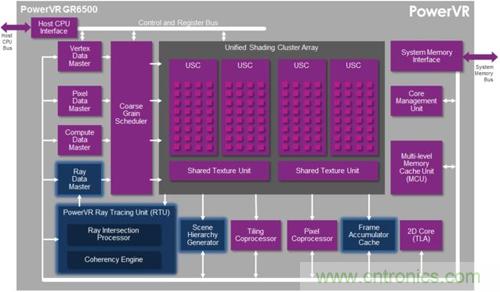 新家族的第一名成員是PowerVR GR6500,基于最新一代的四陣列移動GPU PowerVR Rogue設(shè)計而來,整合了PowerVR Series6 XT系列的所有特性,并加入了強(qiáng)大的光線追蹤硬件加速電路。
