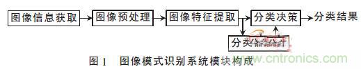 圖像識別技術是利用計算機視覺采集物理對象,以圖像數據為基礎,讓機器模仿人類視覺,自動完成某些信息的處理功能,達到人類所具有的對視覺采集圖像進行識別的能力,以代替人去完成圖像分類及識別的任務。圖像模式識別系統(tǒng)通常由五個模塊組成,如圖1所示。