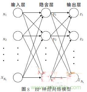 三層BP神經網絡的模型如圖8所示,包括輸入層、隱含層和輸出層,各層間由連接權值構成。BP神經網絡的訓練過程由信號的正向傳播和誤差的反向傳播兩個過程組成,其學習的本質是各連接權值的動態(tài)調整。隨著網絡的不斷學習,權值也不斷的調整,直到誤差減少到可接受的程度或者訓練達到預定的訓練次數。