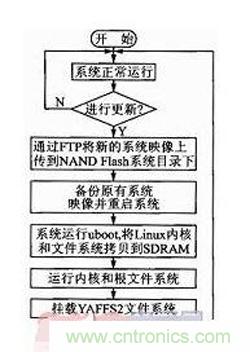 本設(shè)計(jì)對uboot和Linux內(nèi)核進(jìn)行改造,使其支持YAFFS2文件系統(tǒng),對系統(tǒng)添加ftp、telnet等應(yīng)用服務(wù)。系統(tǒng)更新流程如圖2所示。系統(tǒng)正常運(yùn)行時管理人員可以通過telnet遠(yuǎn)程登錄到嵌入式終端進(jìn)行監(jiān)控和管理。當(dāng)需要對系統(tǒng)進(jìn)行更新時,通過遠(yuǎn)程管理系統(tǒng)的ftp客戶端登錄到嵌入式終端,將需要更新的內(nèi)核映像和文件系統(tǒng)上傳到NAND Flash。上傳完畢后對原有的內(nèi)核映像和文件系統(tǒng)進(jìn)行備份并重啟系統(tǒng)。系統(tǒng)重啟后uboot將NAND Flash中更新后的內(nèi)核映像和文件系統(tǒng)搬運(yùn)到SDRAM中,然后跳轉(zhuǎn)到SDRAM中啟動Linux系統(tǒng),掛載YAFFS2文件系統(tǒng),啟動各種應(yīng)用服務(wù)。
