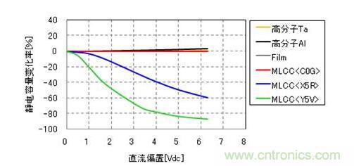 直流偏置特性是指,對電容器施加直流電壓時實際靜電容量發生變化(減少)的現象。這種現象是使用了鈦酸鋇系鐵電體的高介電常數類片狀多層陶瓷電容器特有的現象,導電性高分子的鋁電解電容器(高分子AI)和導電性高分子鉭電解電容器(高分子Ta)、薄膜電容器(Film)、氧化鈦和使用了鋯酸鈣系順電體的溫度補償用片狀多層陶瓷電容器(MLCC)上幾乎不會發生這種現象(參照圖1)。