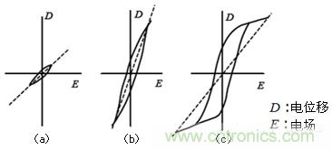 如上所述,鐵電體陶瓷的結晶粒(Grain)有分域(Domain),各個自發極化(Ps)的方向是隨機的,整體上相當于無極化的狀態。在此之上施加電場(E)時,電場方向上產生極化,達到飽和值。在這種狀態下即使去除電場,極化方向也不會回到原來無序隨機的狀態,多少會停留在極化時的狀態上,形成殘留極化,在外部顯現。為了讓這種殘留極化歸零,需要反方向的電場。逆電場進一步增強時會發生極化反轉,向相反方向進行極化。類似這樣的因外部電場而引起的鐵電體的極化動作如圖4的D-E歷史曲線(磁滯曲線)。