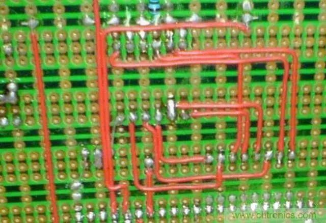 對于元器件在萬能板上的布局,大多數(shù)人習(xí)慣“順藤摸瓜”,就是以芯片等關(guān)鍵器件為中心,其他元器件見縫插針的方法。這種方法是邊焊接邊規(guī)劃,無序中體現(xiàn)著有序,效率較高。但由于初學(xué)者缺乏經(jīng)驗,搭出來的板是這樣的……