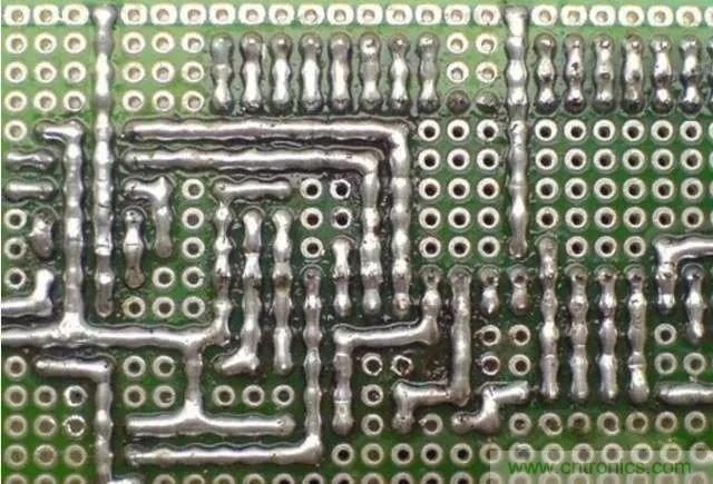 網(wǎng)上還流行一種方法叫錫接走線法,如下圖所示,工藝不錯,性能也穩(wěn)定,但比較浪費錫。純粹的錫接走線難度較高,受到錫絲、個人焊接工藝等各方面的影響。如果先拉一根細(xì)銅絲,再隨著細(xì)銅絲進行拖焊,則簡單許多。洞洞板的焊接方法是很靈活的,因人而異,找到適合自己的方法即可。