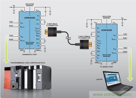 要在惡劣的工業(yè)環(huán)境下實現魯棒的數據通信鏈路,RS-232 診斷端口必須在 RS-232 電纜網絡與相連系統(tǒng)之間提供一個隔離接口,以預防高噪聲環(huán)境中的電壓尖峰和接地環(huán)路并提高系統(tǒng)穩(wěn)定性(圖 1).RS-232 通信鏈路的電源隔離利用隔離式 DC/DC電源或 ADI 公司的 isoPower®集成式 DC/DC 轉換器技術實現。