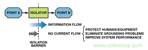 如圖 2 所示,隔離柵在 RS-232 總線和與該總線相連的每個系統(tǒng)之間提供電隔離,既允許在兩點之間傳輸數字數據,又可防止接地環(huán)路電流流過;這樣可以消除耦合到通信電纜上的噪聲,從而降低信號失真和誤差。