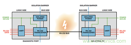 要提供隔離式 RS-232 通信接口,兩端的器件必須與所連的RS-232 電纜相互隔離。要隔離數據鏈路,則必須對數據信號線路和用于驅動該電纜的電源進行隔離。來自診斷端口上UART 的數據需要跨越隔離柵并傳輸至隔離總線側上的RS-232 收發(fā)器。本地 5 V/3.3 V 電源也需要跨越隔離柵來為隔離總線側上的 RS-232 收發(fā)器供電。工業(yè) PC 端也同樣需要如此:數據和電源均需要跨越隔離柵(圖 3).通過將器件與 RS-232 電纜網絡隔離開來,診斷端口和工業(yè) PC電路均受到保護,不受惡劣環(huán)境下可能耦合到 RS-232 電纜上的瞬變影響。隔離還可以中斷因診斷端口和工業(yè) PC 端存在不同接地電位而可能出現的接地環(huán)路。RS-232 總線上可能出現的高共模電壓不能跨越隔離柵,從而保護隔離數據的用戶。