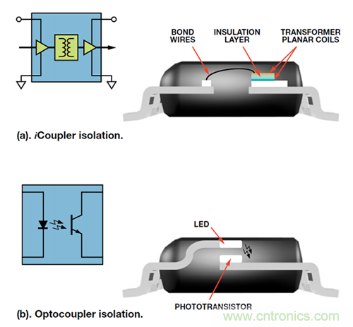圖 4 比較了兩種主要隔離技術。iCoupler 技術(圖 4(a))利用厚膜工藝技術構建可實現 2.5 kV 隔離的微型片上變壓器,從而在 RS-232 系統(tǒng)中提供信號隔離。較古老但廣泛采用的光耦合器解決方案(圖 4(b))則采用發(fā)光二極管(LED)和光電二極管。LED 用于將電信號轉換為光,光電檢測器則用于將光轉換回為電信號。電光轉換本身的低轉換效率導致功耗相對較高;光電檢測器的慢速響應則限制其速度;而老化問題會限制其使用壽命。