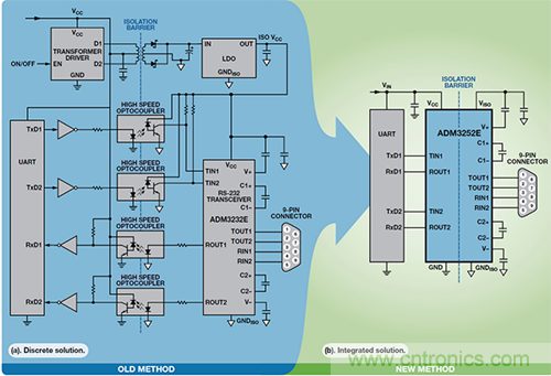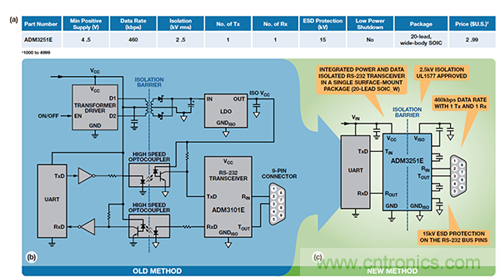 圖8. 單通道 RS232 收發(fā)器應用 (a) ADM3251E 規(guī)格(b) 傳統(tǒng)方法 (c) iCoupler + isoPower 方法