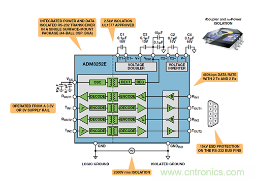 ADM3252E即是這樣的一個例子,它是一個緊湊器件中的隔離式雙通道RS-232 收發(fā)器。iCoupler隔離技術至少在以下五個方面克服了舊式光耦合器解決方案所造成的限制:集成(由于iCoupler支持雙向操作,因此可縮小總體尺寸并降低系統(tǒng)成本)、性能更高、功耗更低、易于使用且可靠性更高。