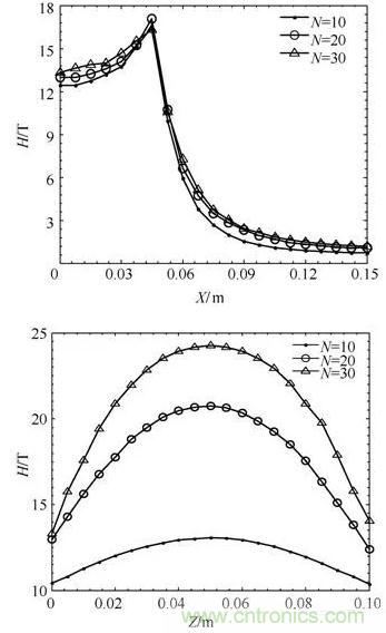 從圖9可以看出:線圈匝數從10N增加到30N過程中,徑向方向的磁場強度在同一位置處幾乎沒有變化,而縱向方向的磁場強度在同一位置處隨著匝數增加明顯變大,并且在縱向上的磁通量輻射的距離也隨著匝數的增加而變廣。