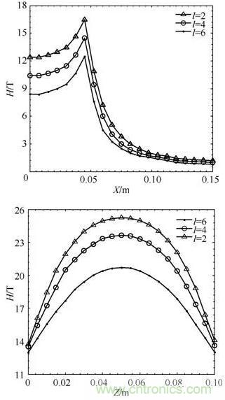 1)線圈產生的磁場強度在徑向上由線圈半徑附近向兩端衰減,縱向上線圈上下兩端處磁場強度有最大值。