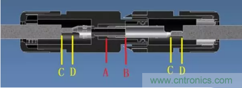 安裝不到位是引起Rco增大的主要因素之一。每個(gè)公司的連接器插合后為了能保證通流,A-B段(圖2)的搭接長度是一定的,目的就是為了保證兩個(gè)金屬件完全接觸。如果在連接器的組裝過程中出現(xiàn)安裝不到位的情況則金屬件的插合就會(huì)出現(xiàn)異常,如圖6。